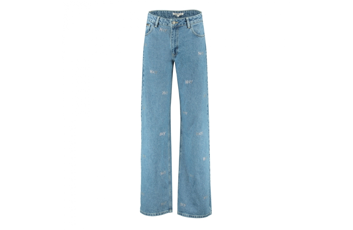 Harper and Yve yve-pa jeans. Dit rechtvallende model sluit door middel van een knoop en rits. Deze blauwe jeans van Harper & Yve is bewerkt met glitter steentjes en beschikt over 5-pocket zakken.