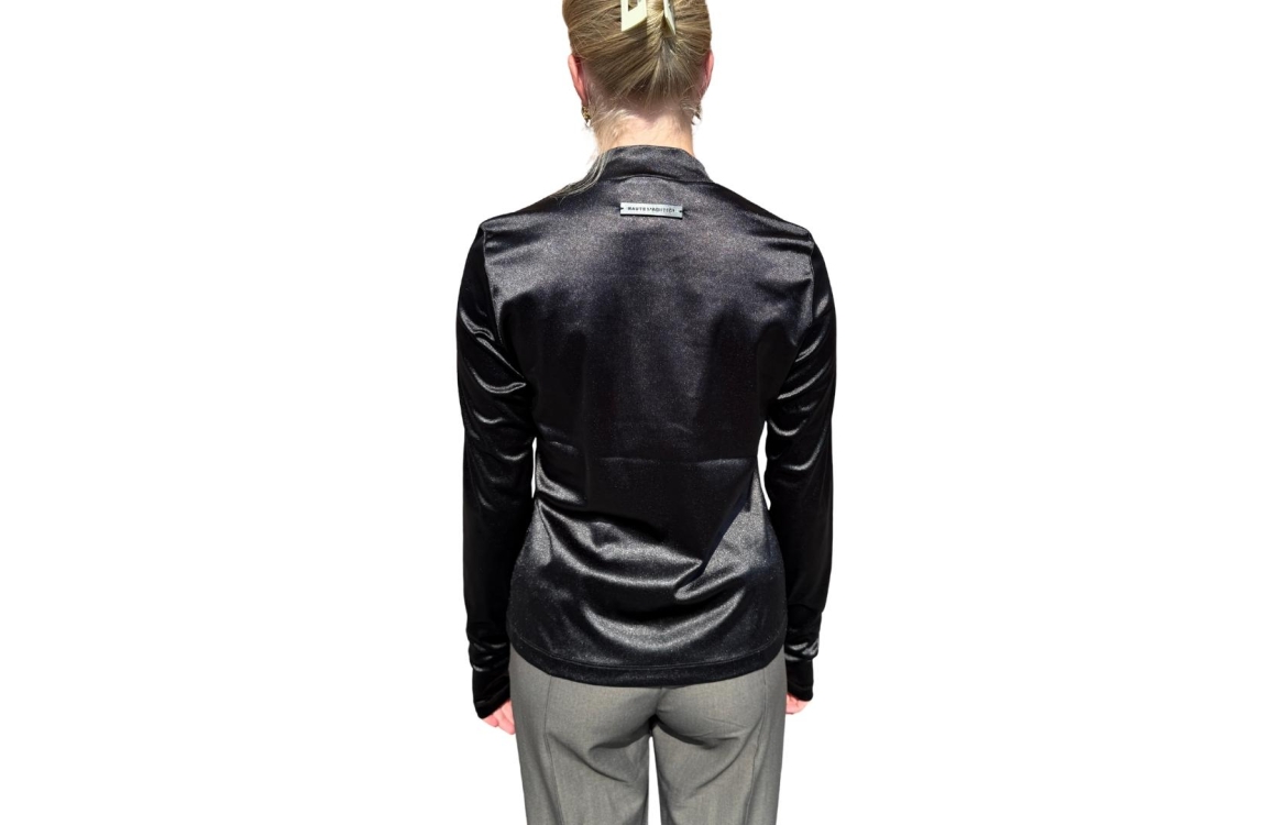 Haute L Amitie shirt HL10281. Dit licht getailleerde model heeft een ronde halslijn en lange mouwen. Deze zwarte shirt van Haute L Amitie is op de linkerborst bewerkt met het merkembleem en is all-over uitgevoerd in een satijnen-look.