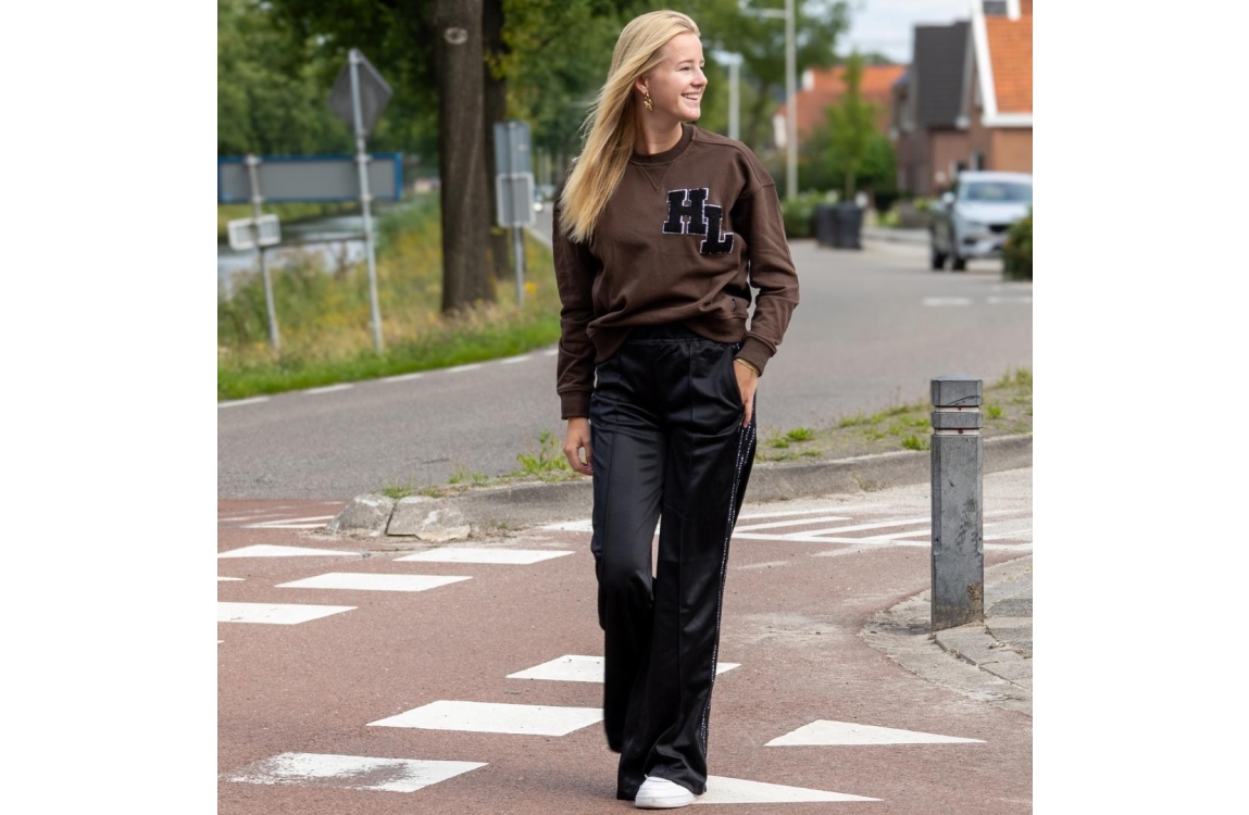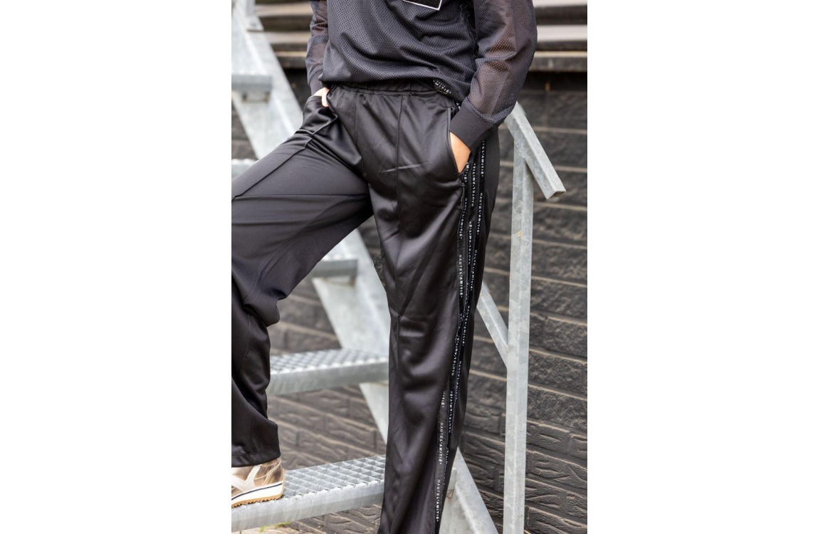 Haute L'Amitié broek HL10342. Dit straight fit sluit door middel van een elastische boord en beschikt over twee ritszakken aan de voorzijde. Deze zwarte sportieve broek is bewerkt met strepen met logo aan de zijkanten en is afgewerkt met decoratieve stiksels. Dit model is halverwege bewerkt met het label aan de rechterzijde.