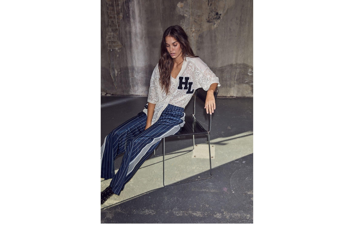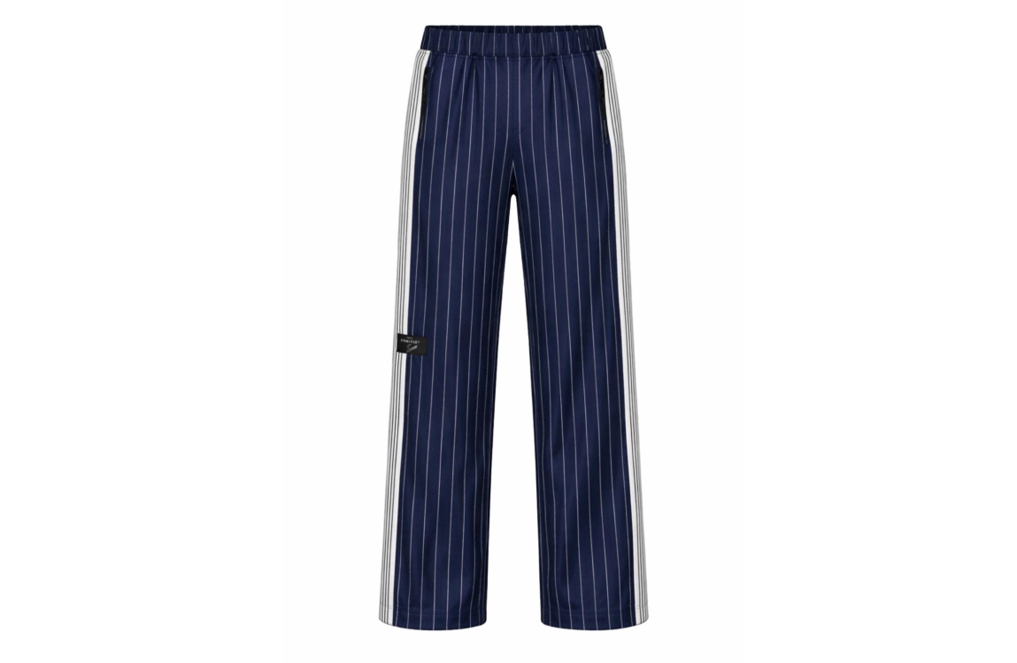 Haute L Amitie Pin Stripe Zip Sweat Navy. Dit straight fit sluit door middel van een elastische boord en beschikt over twee ritszakken aan de voorzijde. Deze donker blauwe sportieve broek is bewerkt met strepen, met het logo en een bies aan de zijkanten.