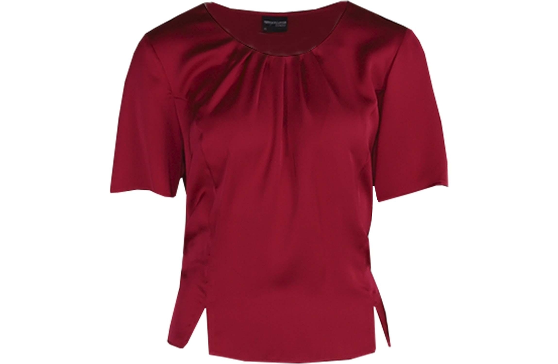 Hermann Lange top 5428-1165. Dit rechtvallend model heeft een ronde hals en korte mouwen. Deze rode top van Hermann Lange heeft een all-over satijnen-look en is afgewerkt met plooitdetails bij de hals.