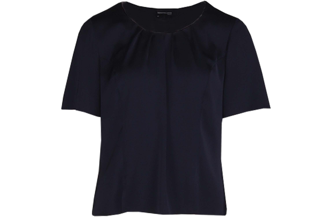 Hermann Lange top 5428-1165. Dit rechtvallend model heeft een ronde hals en korte mouwen. Deze donkerblauwe top van Hermann Lange heeft een all-over satijnen-look en is afgewerkt met plooitdetails bij de hals.