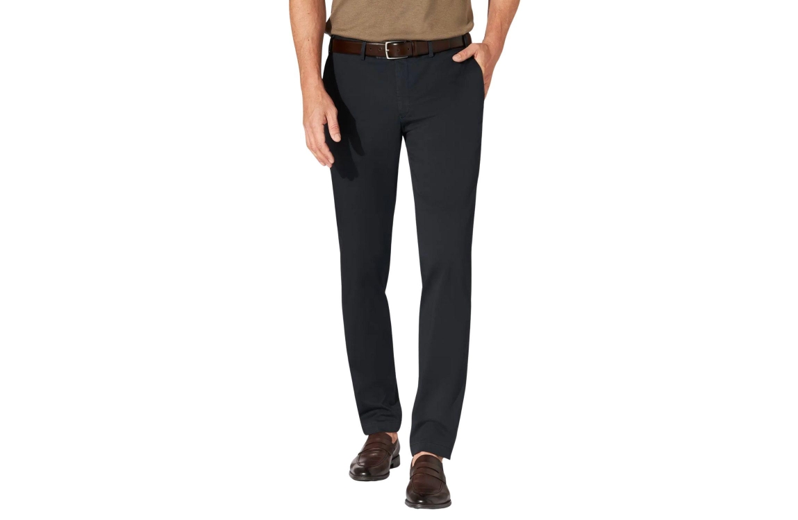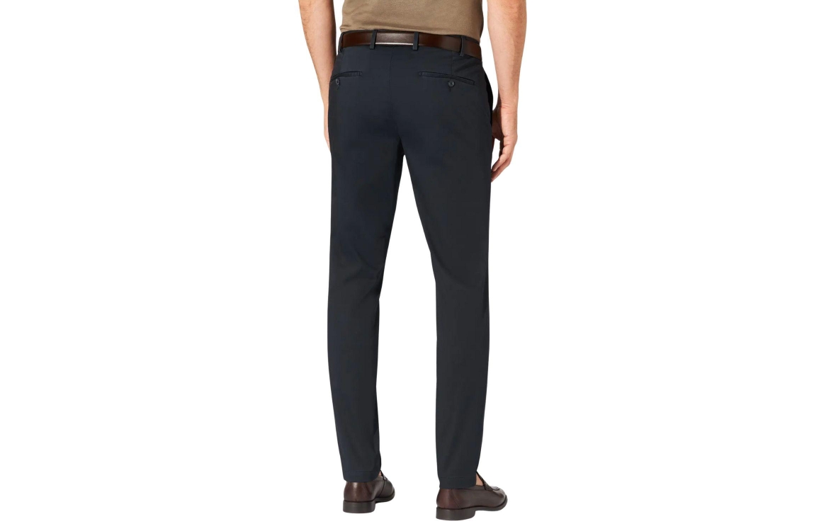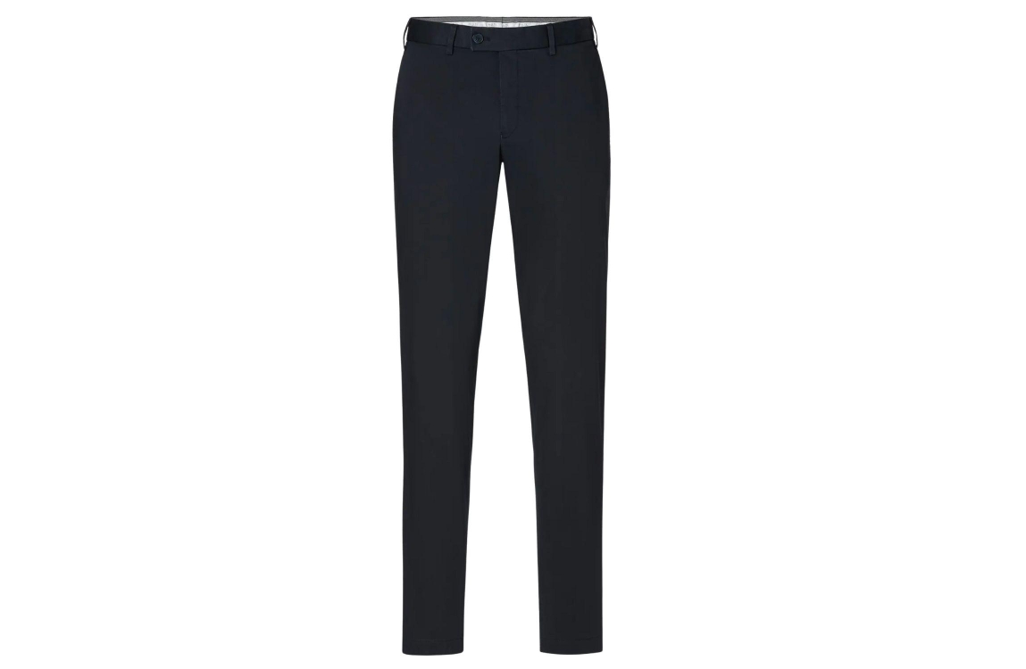Hiltl broek Tilo 72451/44800. Dit slim-fit model sluit door middel van een (schuif)knoop- en ritssluiting met ceintuurlussen. Deze donkerblauwe broek van Hiltl is voorzien van twee steekzakken aan de voorzijde met een muntzakje en twee sluitbare papselzakken aan de achterzijde.