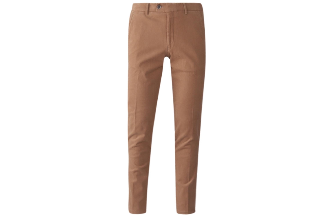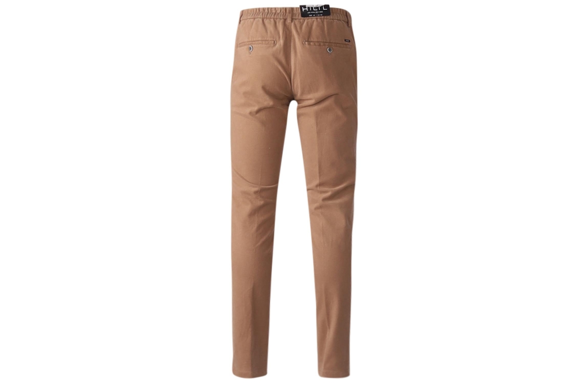Hiltl broek Trento. Dit slim fit model sluit door middel van een (schuif)knoop- en ritssluiting met ceintuurlussen. Deze Camel broek van Hiltl is voorzien van twee steekzakken aan de voorzijde met een muntenzakje en twee sluitbare papselzakken aan de achterzijde.