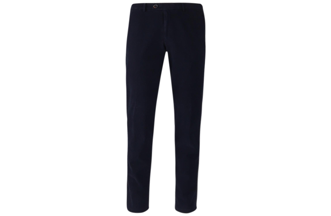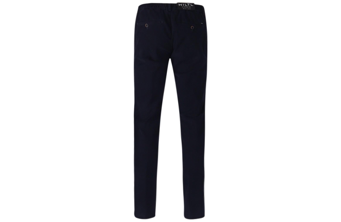 Hiltl broek Trento. Dit slim fit model sluit door middel van een (schuif)knoop- en ritssluiting met ceintuurlussen. Deze donker blauwe broek van Hiltl is voorzien van twee steekzakken aan de voorzijde met een muntenzakje en twee sluitbare papselzakken aan de achterzijde.
