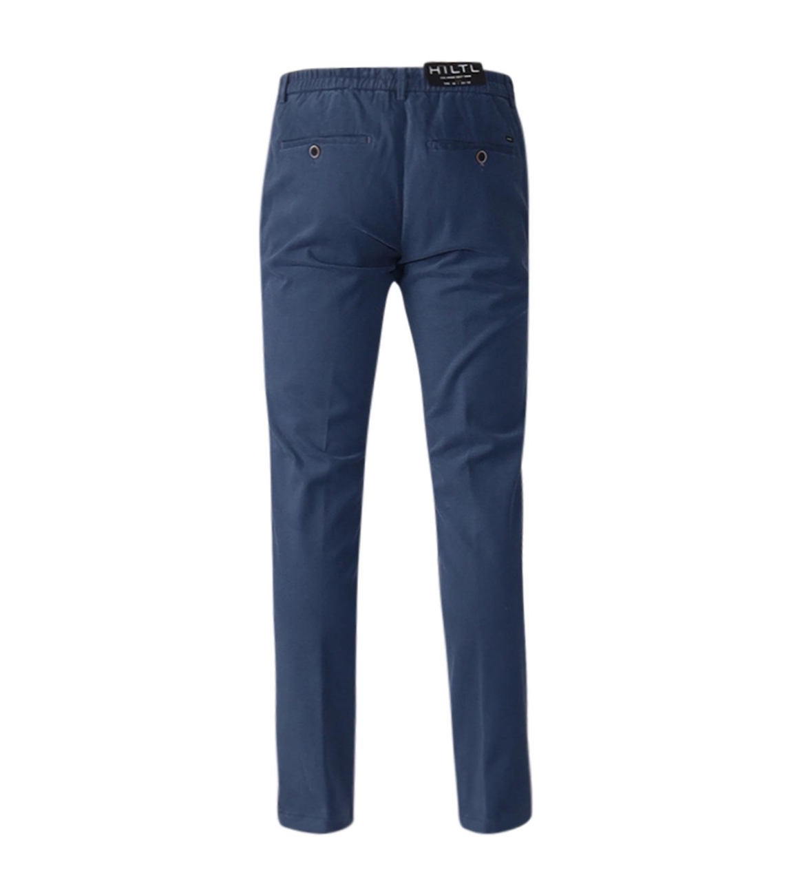 Hiltl broek Trento. Dit slim fit model sluit door middel van een (schuif)knoop- en ritssluiting met ceintuurlussen. Deze blauwe broek van Hiltl is voorzien van twee steekzakken aan de voorzijde met een muntenzakje en twee sluitbare papselzakken aan de achterzijde.