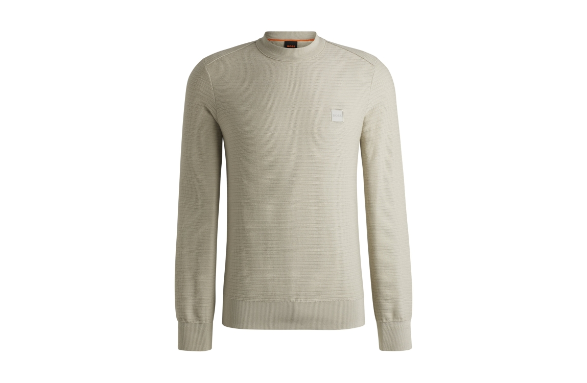 Hugo Boss trui anion_s 10265864 01. Dit regular fit model is voorzien van een ronde hals en heeft lange mouwen. Deze beige sweater van Hugo Boss is uitgevoerd in een fijn breisel voorzien van ribgebreide boorden. Dit model is aan de binnenzijde afgewerkt met een beige breisel.