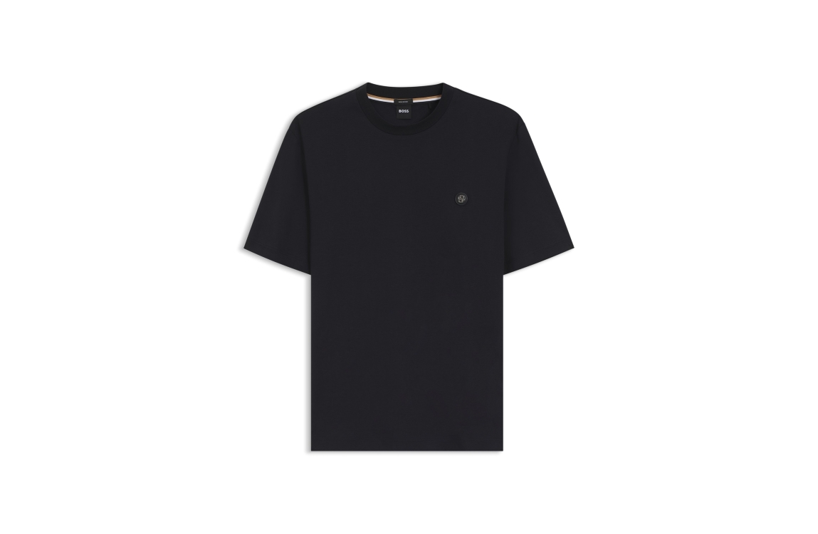 Hugo Boss 50555844 02. Dit rechtvallende model heeft een ronde halslijn en korte mouwen. Deze donkerblauwe T-shirt van Hugo Boss is op de linkerborst gedetailleerd met het merkembleem en is uitgevoerd in stretchkwaliteit.