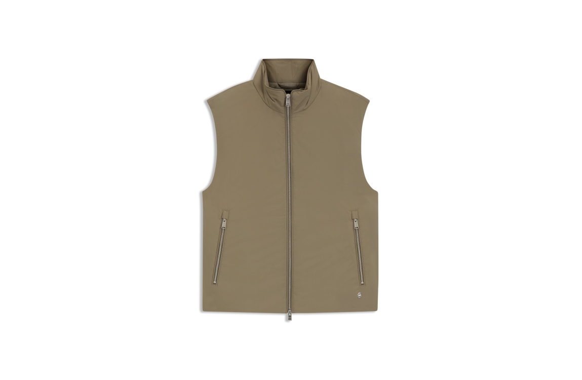 Hugo Boss bodywarmer 50549189 245. Dit rechtvallende model heeft een opstaande kraag en is mouwloos. Deze bruine/groene bodywarmer van Hugo Boss sluit aan de voorzijde door middel van een rits en is voorzien van twee ritszakken.