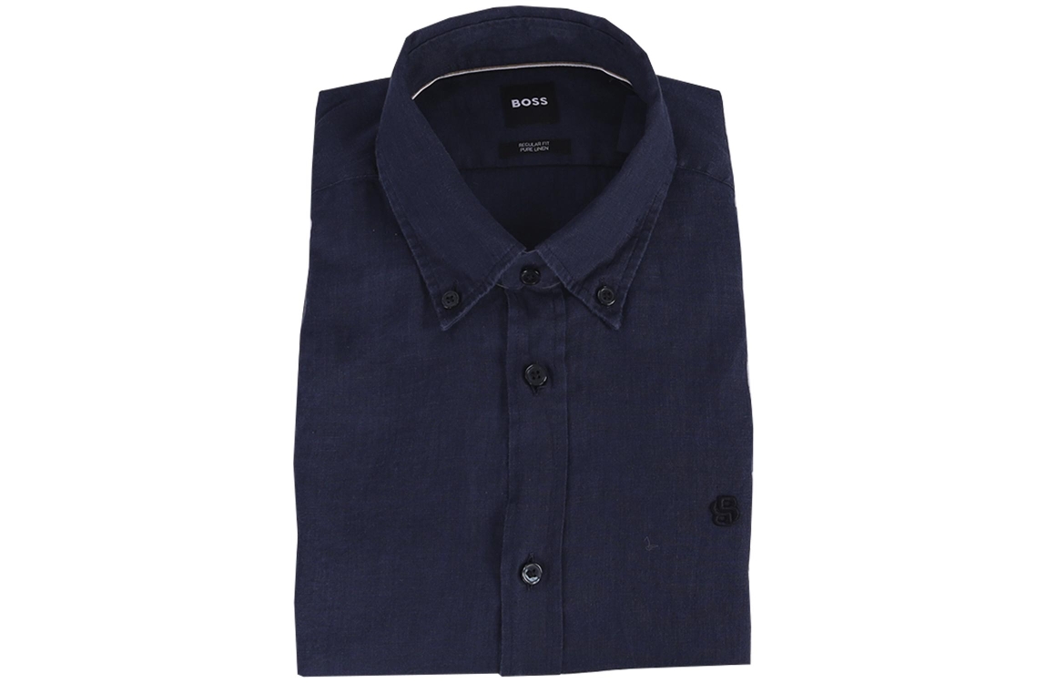 Hugo Boss overhemd 50556077. Dit regular fit model is voorzien van een kraag en heeft lange mouwen afgewerkt met een split en knoop. Dit donkerblauwe overhemd van Hugo Boss sluit aan de voorzijde door middel van knopen.