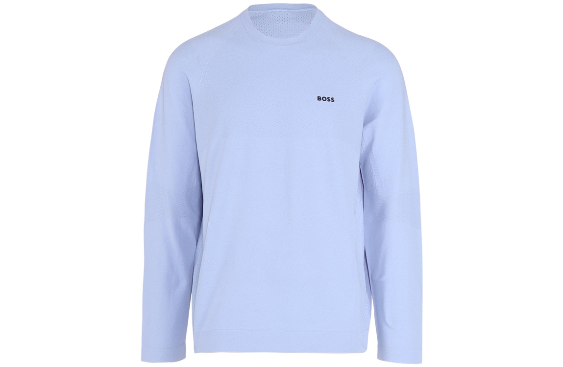 Hugo Boss pullover k_seamless tech_cn 10266436 01. Deze regular fit trui heeft een ronde kraag en heeft lange mouwen. Dez licht blauwe trui van Hugo Boss heeft een sportieve uitstraling heeft een logo op de borst en is afgewerkt met ventilatiegaatjes en een boord.