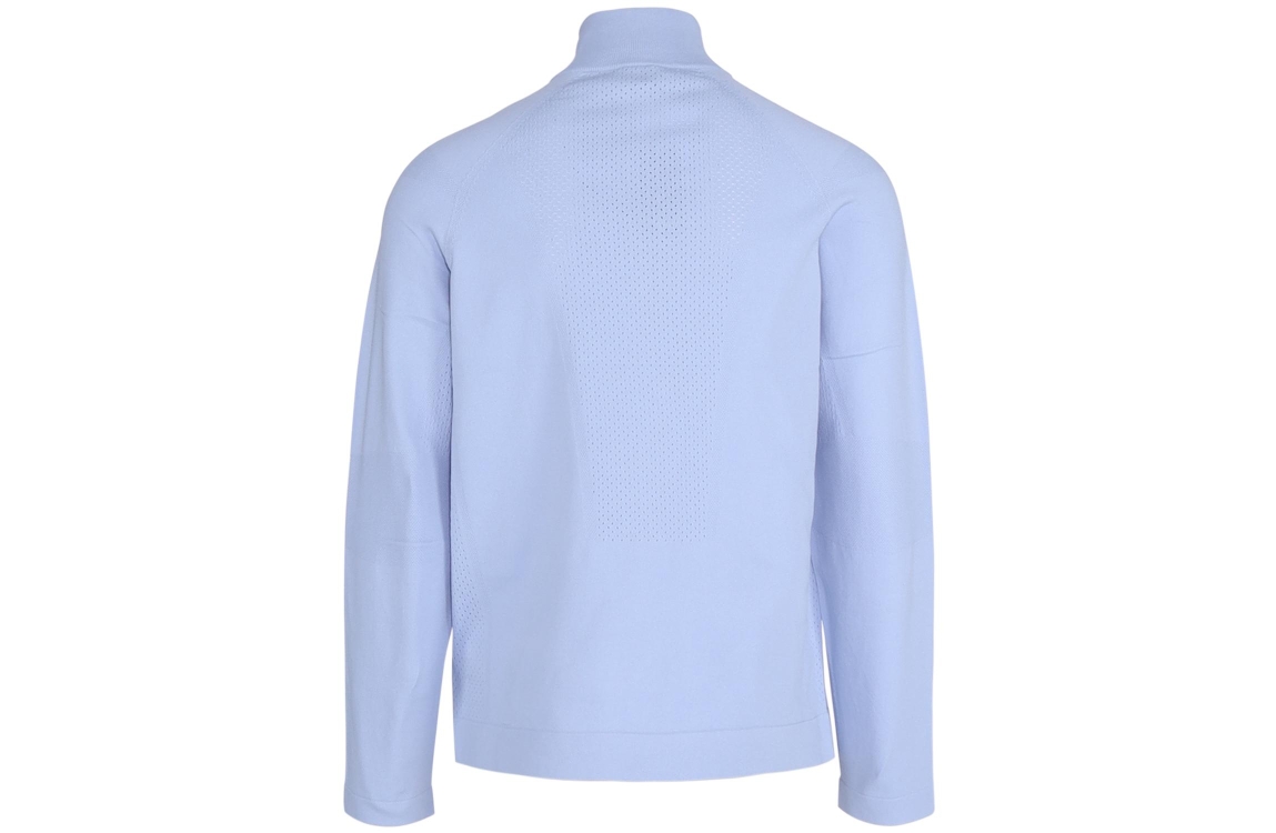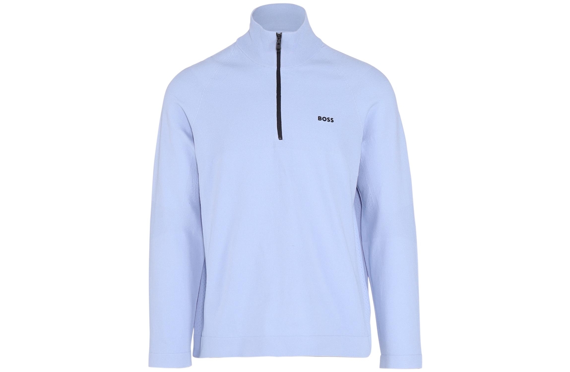 Hugo Boss pullover k_seamless tech_qz 10266419 01. Deze regular fit trui heeft een omhoogstaande kraag met rits en heeft lange mouwen. Deze licht blauwe trui van Hugo Boss heeft een sportieve uitstraling heeft een logo op de borst en is afgewerkt met ventilatiegaatjes en een boord.