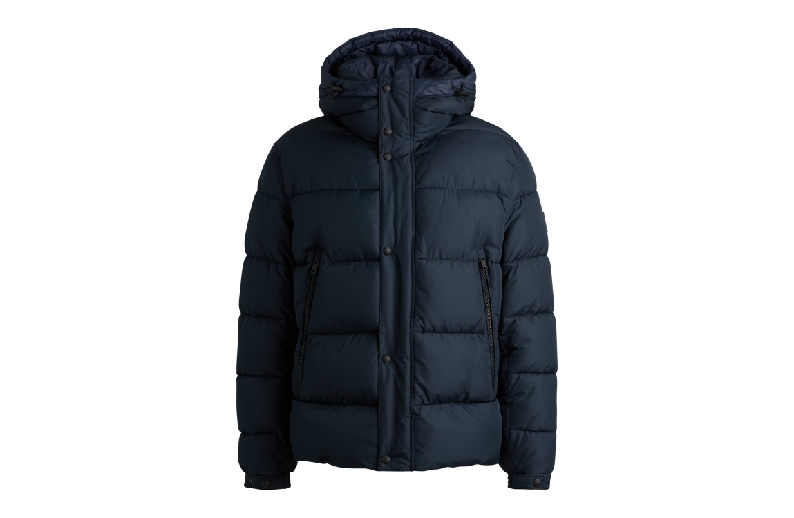 Hugo Boss jas 50528573 404. Dit regular fit model heeft een capuchon en lange mouwen. Deze donkerblauwe jas van  Hugo Boss sluit aan de voorzijde door middel van een ritssluiting met knopen is voorzien van twee grote ritszakken.