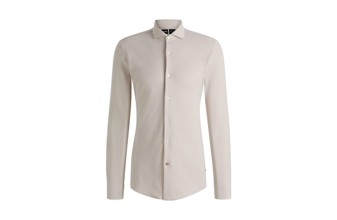 Hugo Boss P-HANK-spread-243 10262046 01 275 Light beige. Dit rechtvallende model is voorzien van een kraag en heeft lange mouwen. Dit beige shirt van Hugo Boss sluit door middel van knopen.