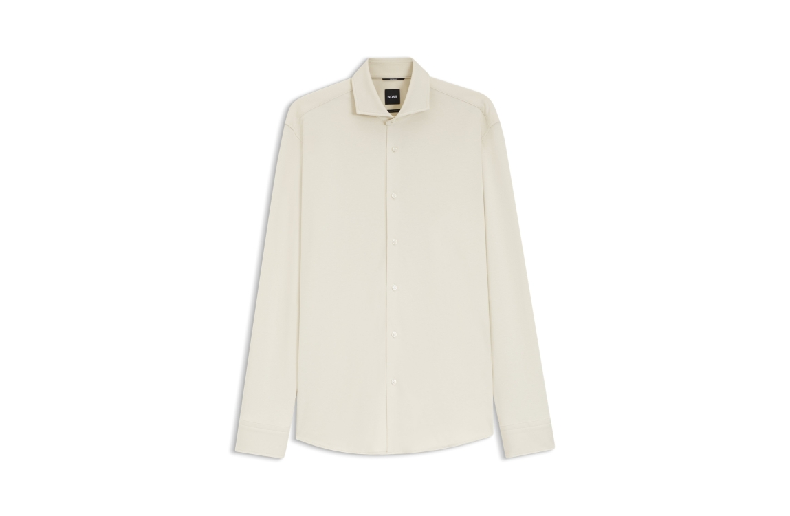 Hugo Boss overhemd 50556854 131. Dit regular fit model heeft een kraag en lange mouwen. Deze off-white overhemd van Hugo Boss sluit aan de voorzijde door middel van knoopsluitingen en is uitgevoerd in lichte stretchkwaliteit.