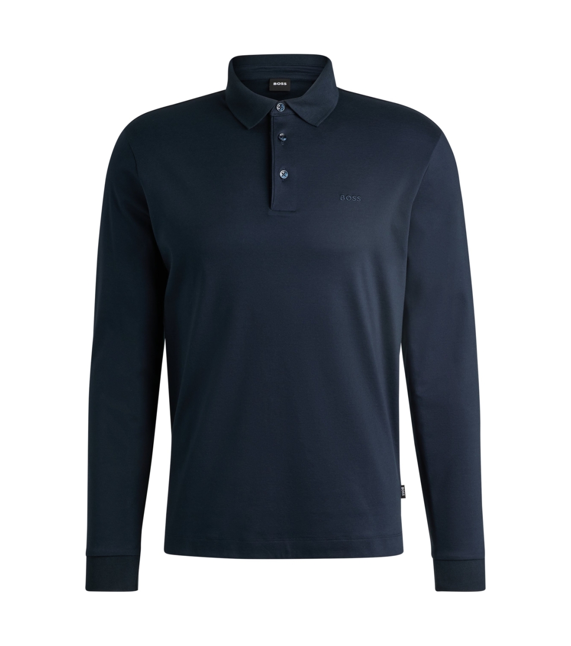 Hugo Boss poloshirt Pado 30 10241542 01. Dit slim fit model heeft een kraag en lange mouwen. Deze donkerblauwe poloshirt van Hugo Boss sluit door middel van knopen aan de bovenzijde.