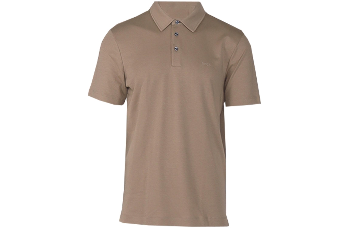 Hugo Boss polo Palosh 3010241542 01. Dit slim fit model is voorzien van een kraag en heeft korte mouwen. Deze beige polo van Hugo Boss is doormiddel van knopen te sluiten en is afgewerkt met splitten aan de onderkant en een merk embleem op de borst.