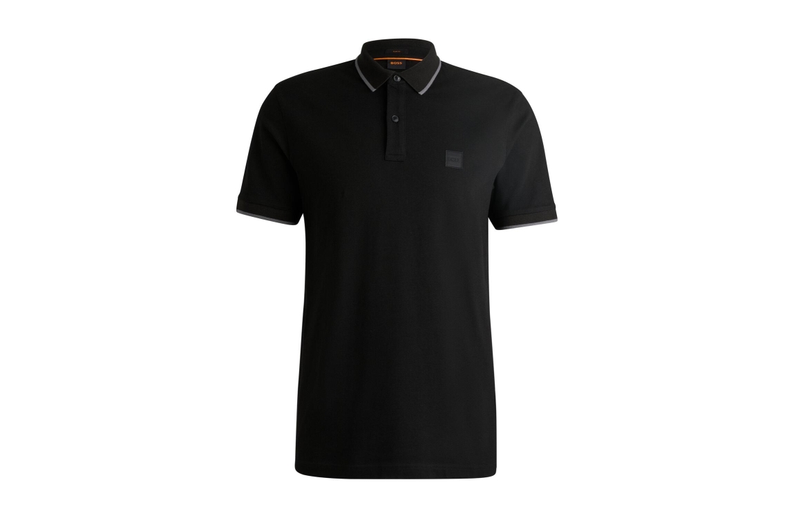Hugo Boss polo 50507699. Dit regular fit model heeft een kraag met sluitbare knopen en korte mouwen. Deze zwarte polo van Hugo Boss is op de linkerborst bewerkt met het merkembleem en is gedetailleerd met een grijs randje op de boorden.