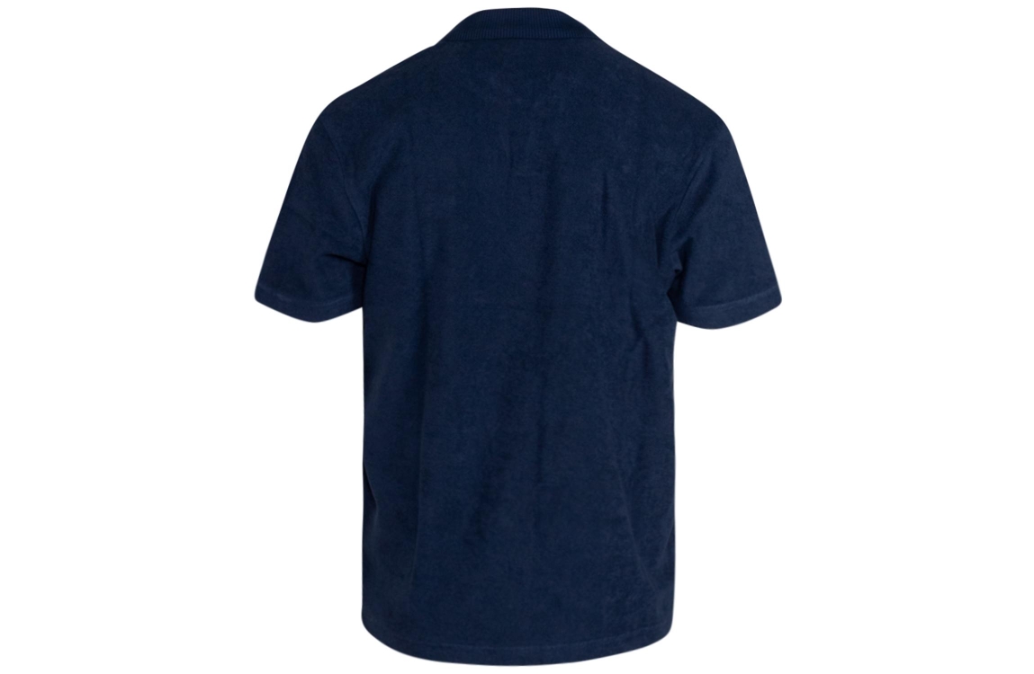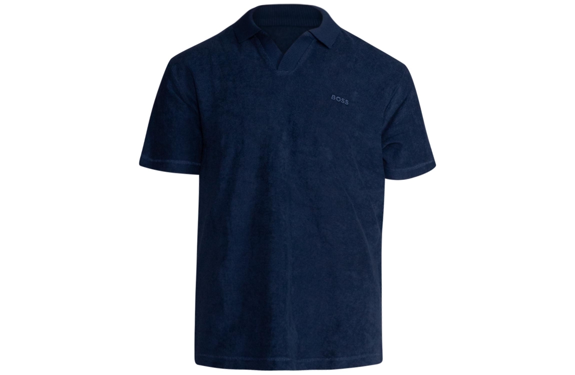 Hugo Boss polo pe_doubletowel 10258111 01. Dit slim fit model heeft korte mouwen en een kraag. Deze open blauwe polo van Hugo Boss is gemaakt van badstof, heeft een logo op de linker borst en is afgewerkt met ribboorden om de kraag.