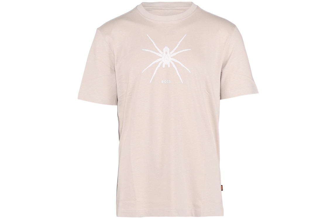 Hugo Boss T-shirt te_spiderbat 10249510 01. Dit slim fit model shirt heeft een ronde kraag en korte mouwen. Dit licht beige t-shirt van Hugo Boss heeft een print van een spin op de borst en heeft een oranje band bij de nek.