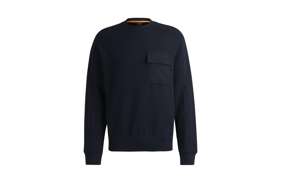 Hugo Boss pullover we_pocketcargo 10244192 01. Deze regular fit pullover heeft een ronde kraag en lange mouwen. Deze blauwe pullover van Hugo Boss heeft een zakje op de borst.