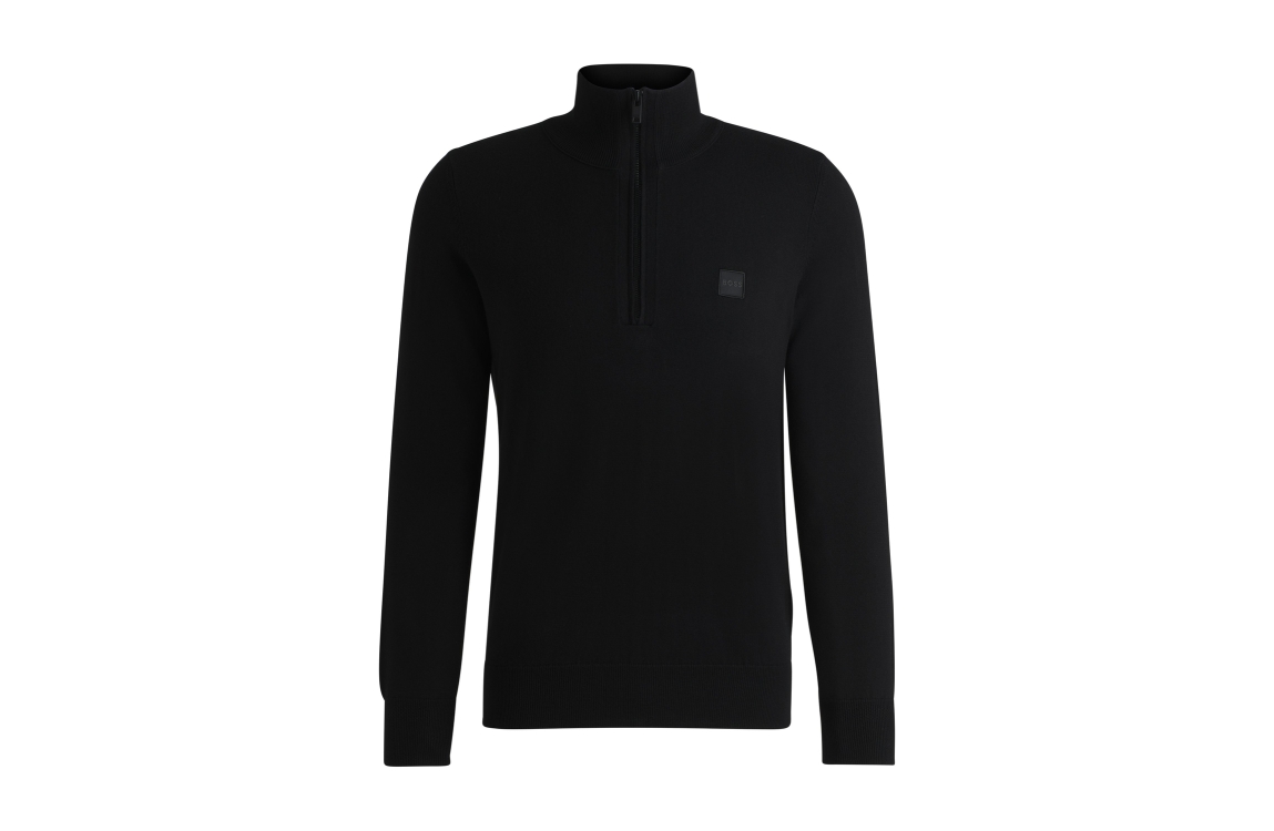 Hugo Boss pullover 50527585 01. Dit rechtvallende model heeft een opstaande kraag met ritssluiting en lange mouwen. Deze zwarte pullover van Hugo Boss is op de linkerborst gedetailleerd met het merkembleem.