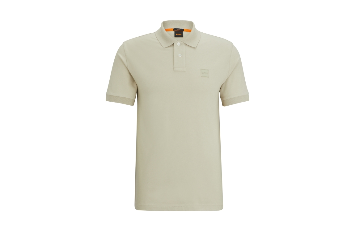 Hugo Boss polo 50507803. Dit slim-fit model is voorzien van een kraag en heeft korte mouwen, deze beige polo van Boss sluit door middel van knopen.