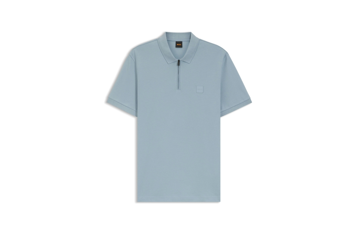 Hugo Boss polo 50537507. Dit rechtvallende model heeft een kraag met ritssluiting en korte mouwen. Deze lichtblauwe polo van Hugo Boss is op de linkerborst gedetailleerd met het merkembleem en is gemaakt van katoen en elastaan.