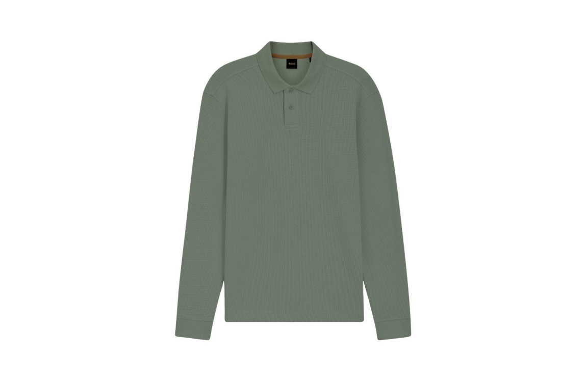 Hugo Boss poloshirt 50520710 076. Dit rechtvallende model heeft een kraag en lange mouwen. Deze groene poloshirt van Hugo Boss is uitgevoerd in een structuur en is uitgevoerd in stretchkwaliteit. Het model is gedetailleerd met het merkembleem op de linkerborst.