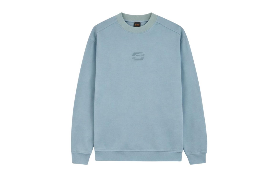 Hugo Boss Orange Techno sweater 50559151. Dit soepelvallend model heeft een ronde hals en lange mouwen. Deze blauwe sweater van Hugo Boss is voorzien van een ton-sur-ton opdruk aan de voorzijde en afgewerkt met elastische boorden aan de onderzijde.