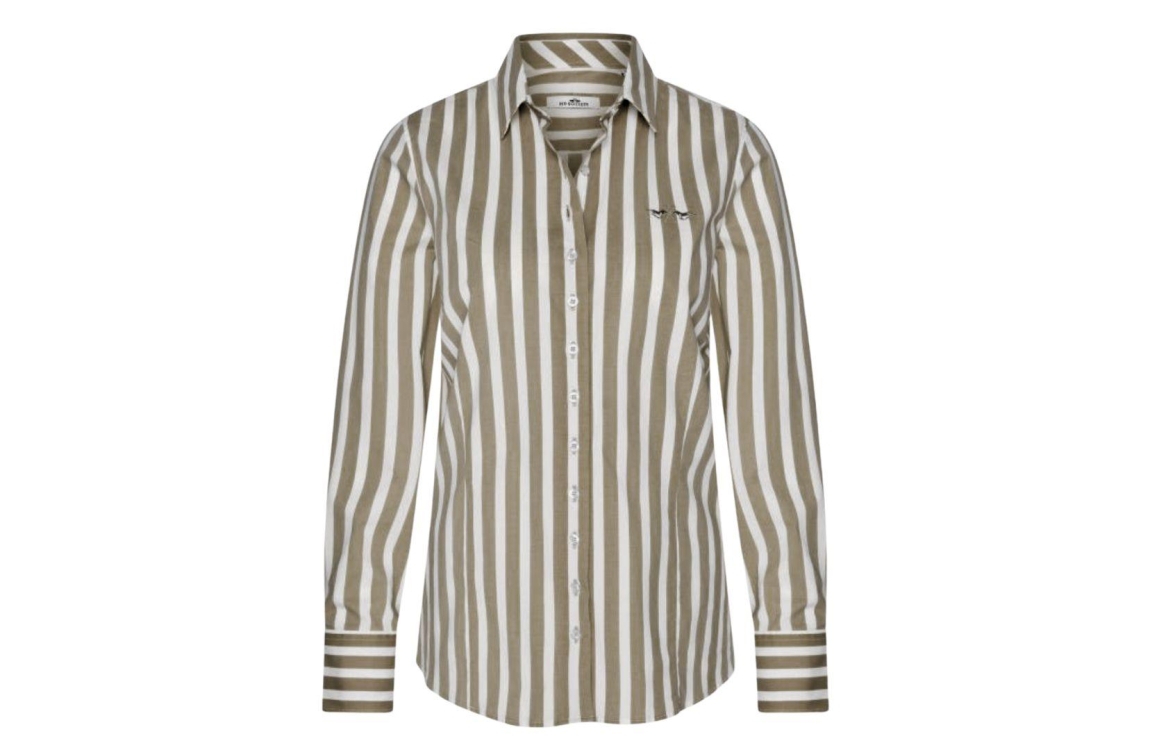 HV Polo blouse hvsIsabella 0404103751. Dit rechtvallend model heeft een kraag, lange mouwen en sluit door middel van knopen. Deze witte blouse van HV Polo is bewerkt met taupe kleurige verticale strepen en afgewerkt met een logo op de borst.