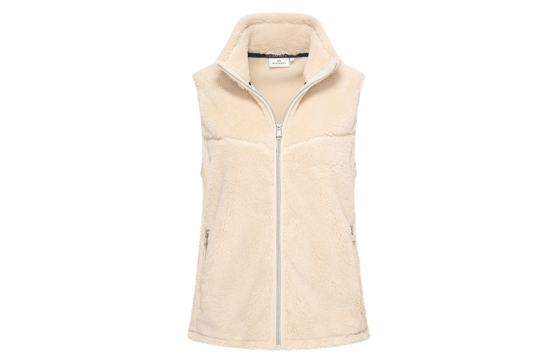 HV Polo Bodywarmer HVSDolce 0401103754. Dit rechtvallende model heeft een ronde hals, is mouwloos en sluit door middel van een rits. Deze beige kleurige bodywarmer is aan de onderzijde afgewerkt met een elastisch trekkoord en voorzien van ritszakken. Deze bodywarmer is gemaakt van een zacht materiaal.