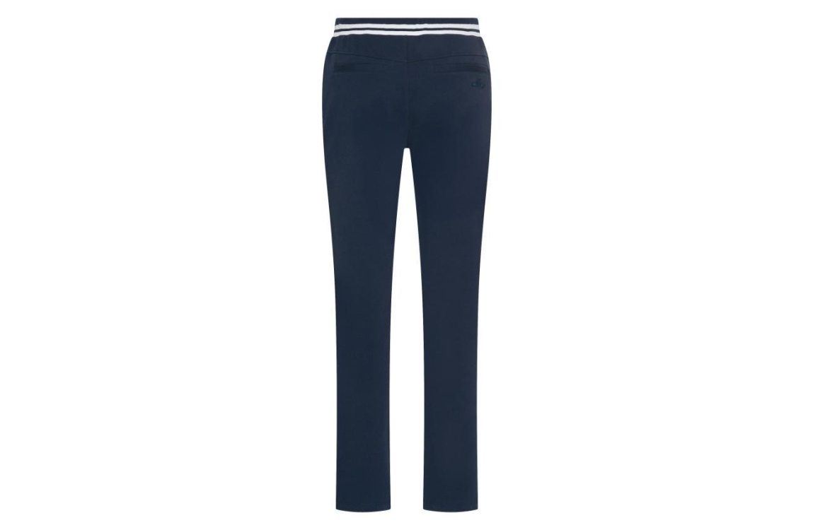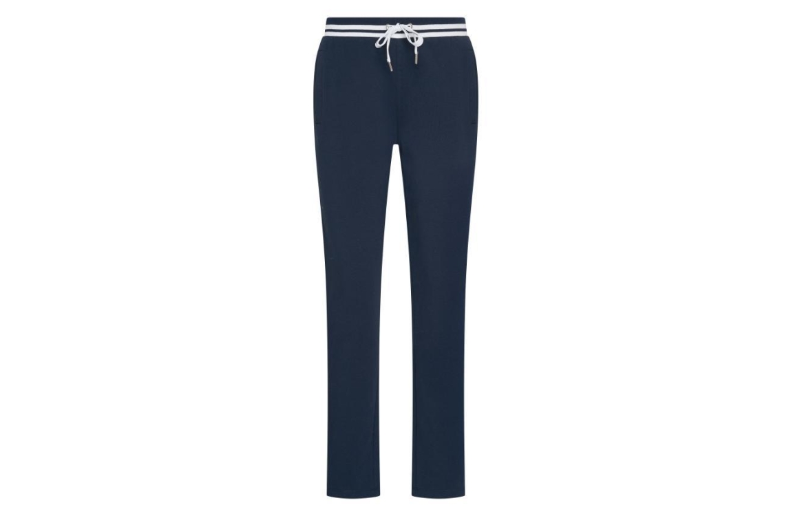 HV Polo Broek HVSGwyneth 0201103801. Dit rechtvallende model sluit door middel van een elastische boord met strik. Deze donkerblauwe broek van HV Polo is bewerkt met een witte bies en voorzien van schuine steekzakken.