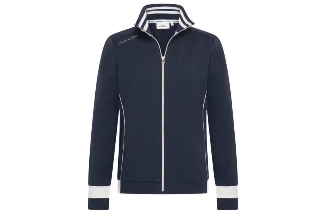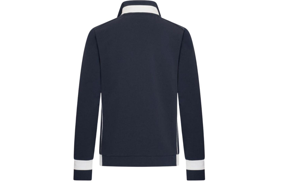 HV Polo cardigan 0401103812. Dit rechtvallende model heeft een opstaande kraag en lange mouwen. Deze donkerblauwe cardigan van HV Polo sluit aan de voorzijde door middel van een ritssluiting en is gedetailleerd met sportieve strepen en strass-steentjes.