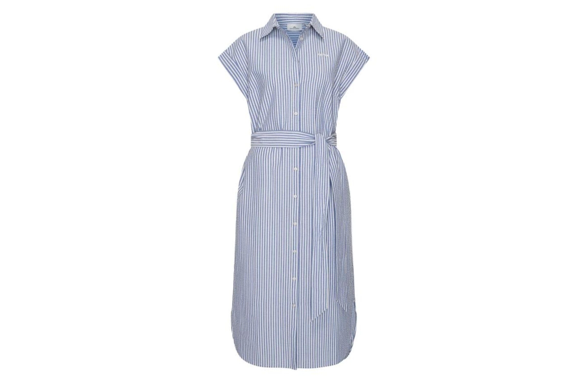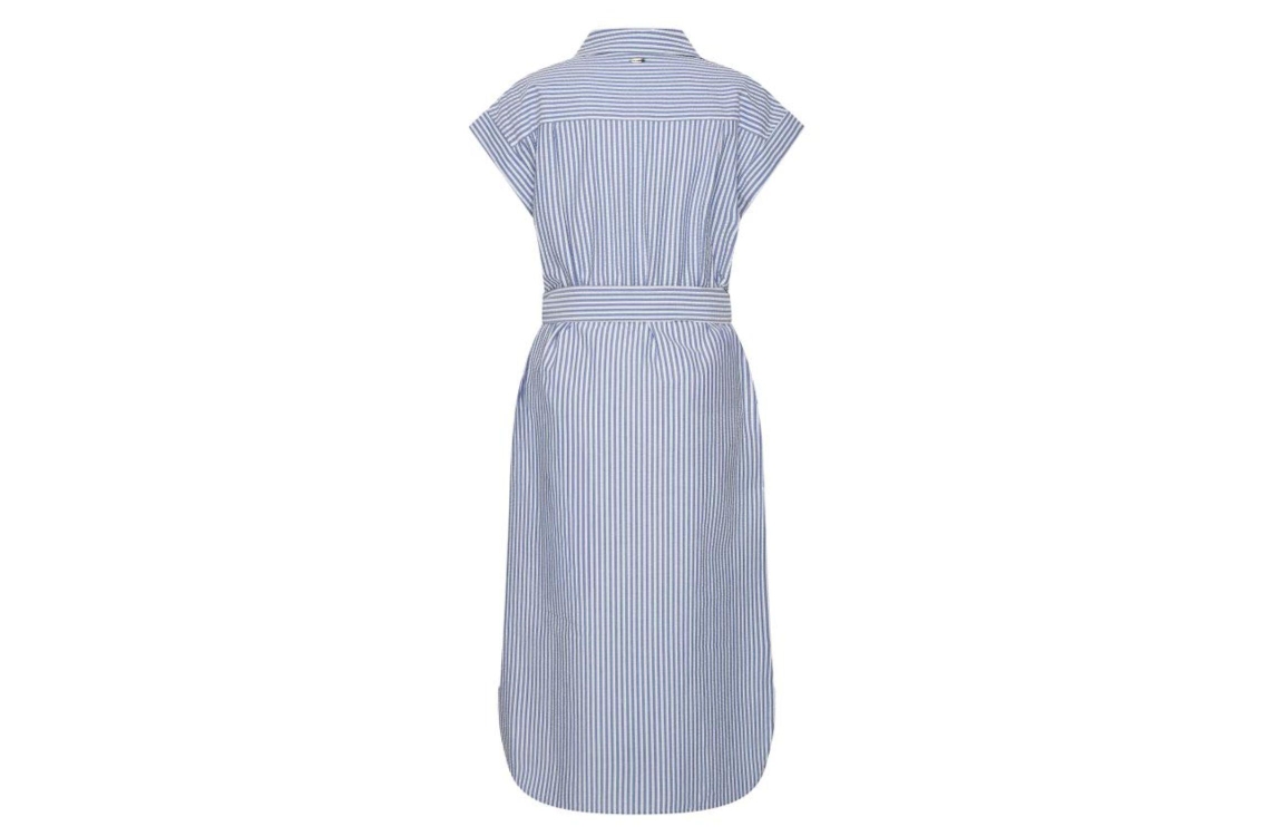 HV Polo Jurk HVSStella Navy. Dit rechtvallende model heeft een kraag, korte mouwen en sluit door middel van knopen. Deze blauw/wit gestreepte jurk van HV-polo beschikt over een ceintuur in de taille.