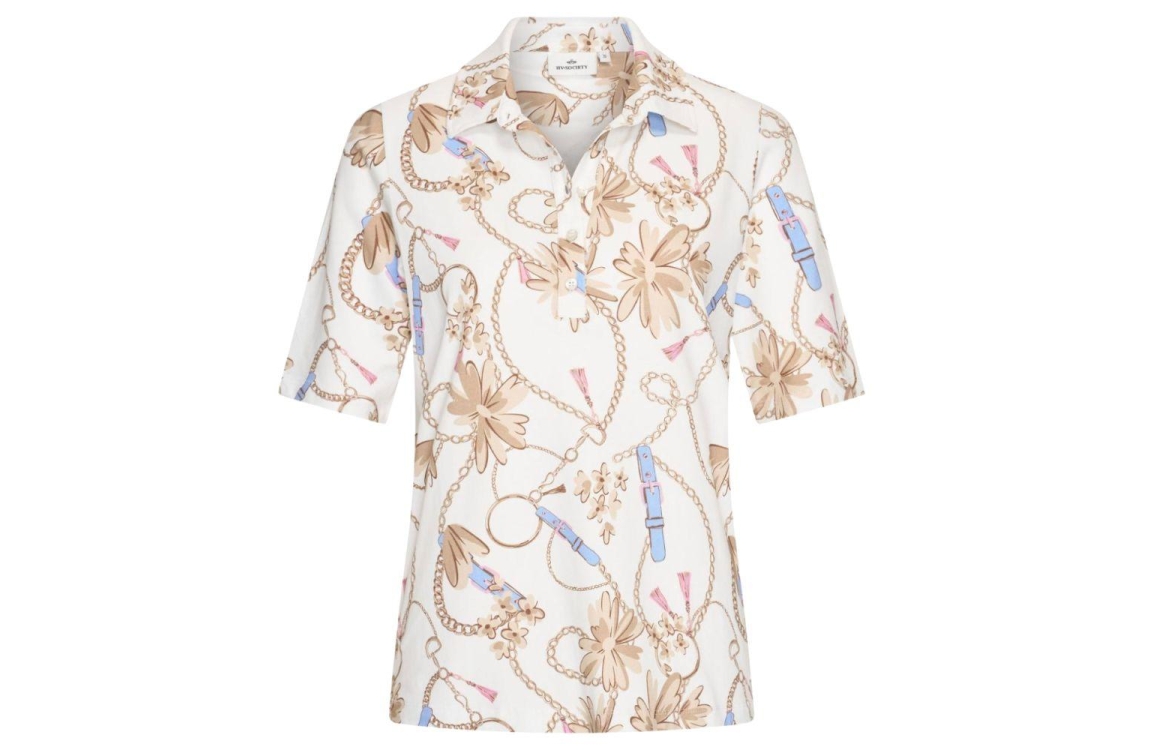 HV Polo poloshirt 0403103813. Dit rechtvallende model heeft een kraag met knoopsluitingen en korte mouwen. Deze witte poloshirt van HV Polo is all-over bewerkt met een print in verschillende kleuren. Het model is uitgevoerd in stretchkwaliteit.