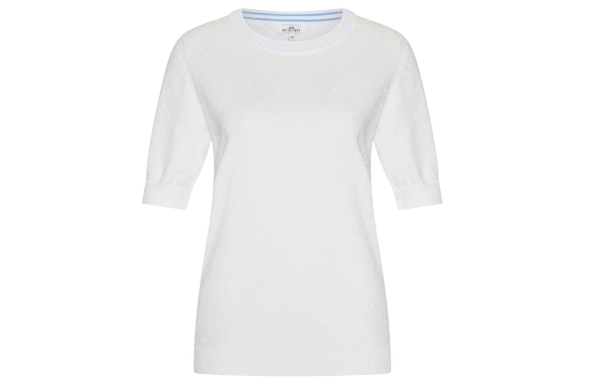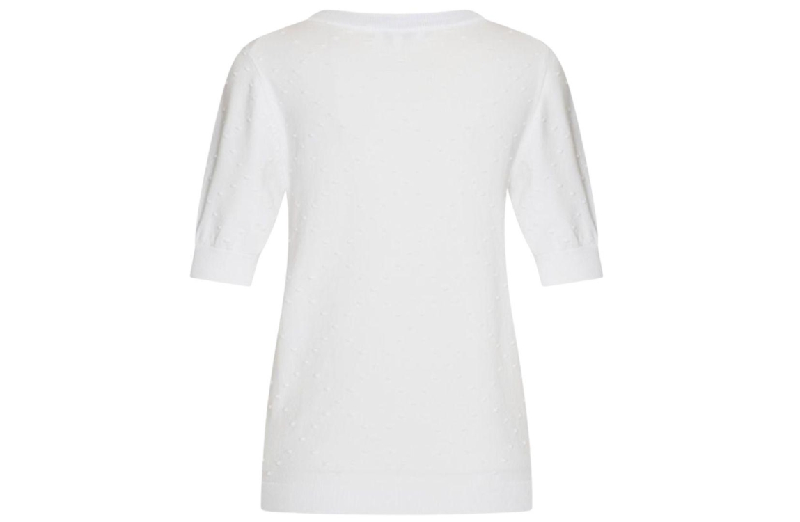 HV Polo pullover 0409103827. Dit rechtvallende model heeft een ronde halslijn en korte mouwen. Deze witte pullover van HV Polo is all-over bewerkt met stofbolletjes en is afgewerkt met ribgebreide boorden.