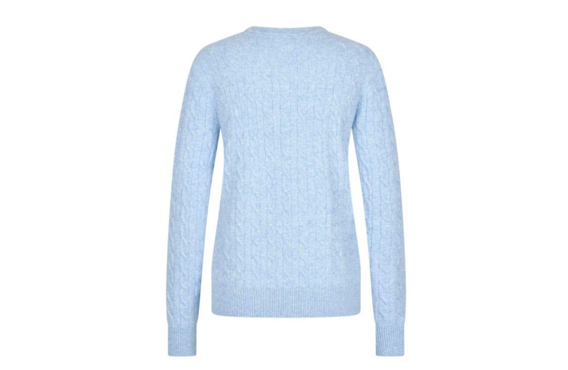 HV Polo pullover HVSCelia 0409103540. Dit rechtvallend model is voorzien van een v-hals en heeft lange mouwen. Deze lichtblauwe pullover van HV Polo is bewerkt met een kabel structuur afgewerkt met het merkembleem aan de voorzijde.