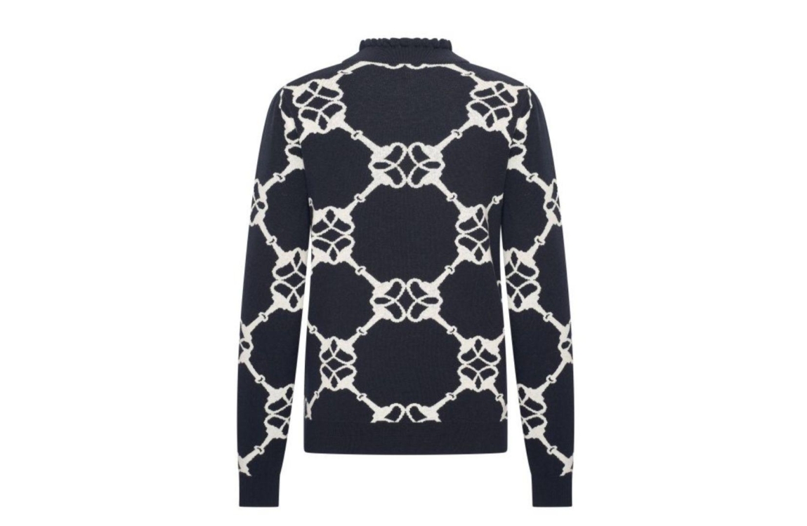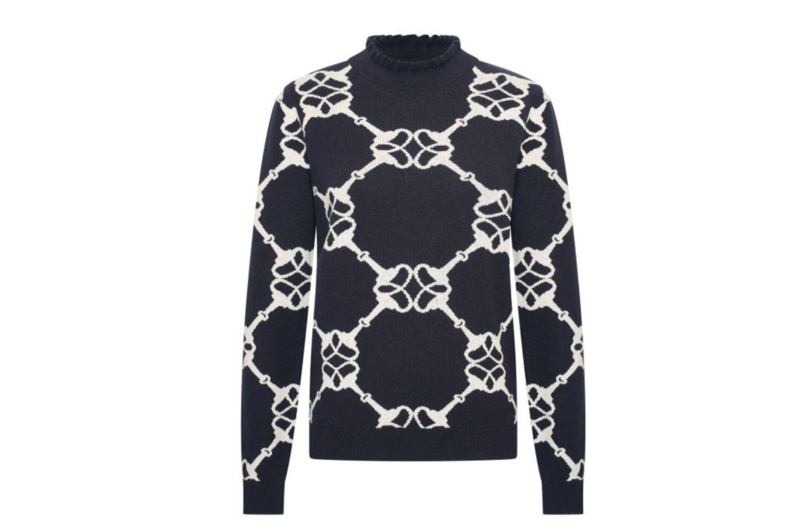 HV Polo pullover HVSLuna 0409103754. Dit rechtvallend model is voorzien van een turtle neck met ruches en heeft lange mouwen. Deze navy kleurige pullover van HV Polo is bewerkt met een witte chain print.