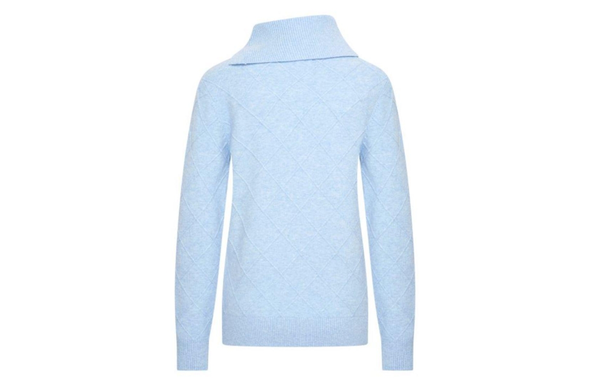 HV Polo pullover HVSMirella 0409103758. Dit rechtvallend model is voorzien van een col afgewerkt met een splitje en heeft lange mouwen. Deze lichtblauwe pullover van HV Polo is bewerkt met een ruit structuur.