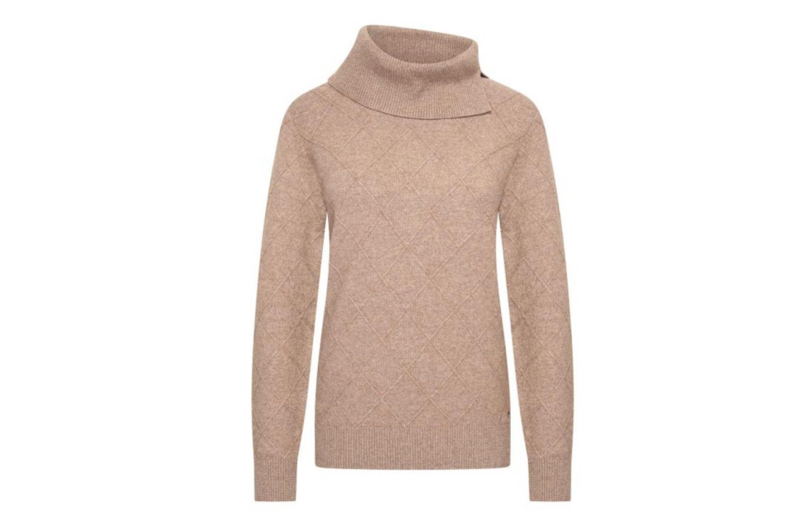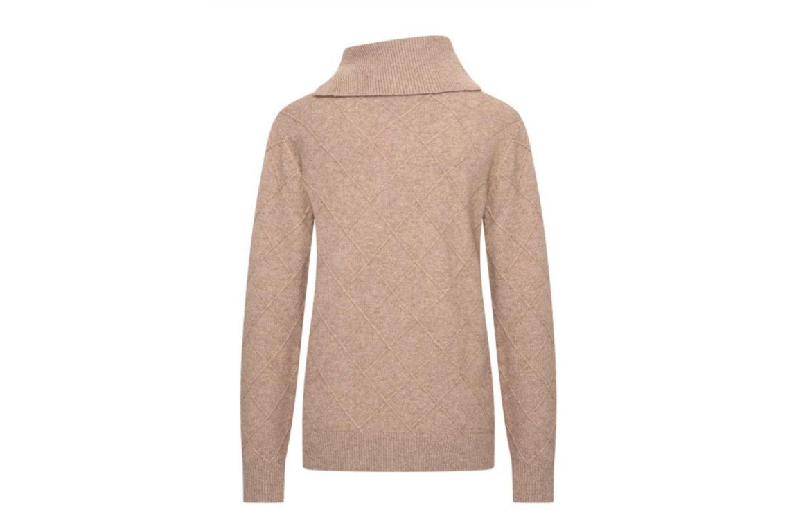 HV Polo pullover HVSMirella 0409103758. Dit rechtvallend model is voorzien van een col afgewerkt met een splitje en heeft lange mouwen. Deze bruine pullover van HV Polo is bewerkt met een ruit structuur.