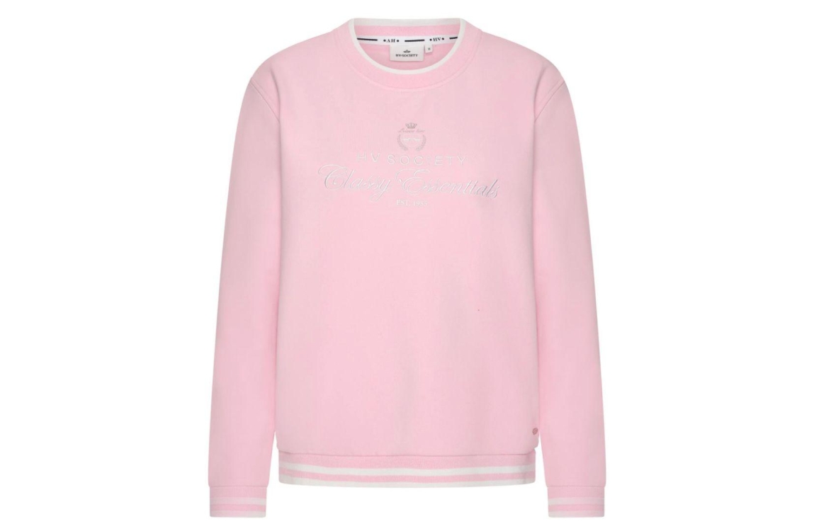 HV Polo sweater HVSGabrielle 0401103811. Dit rechtvallend model is voorzien van een ronde hals en heeft lange mouwen. Deze roze sweater van HV Polo is bewerkt met een geborduurde tekst aan de voorzijde met logo. Dit model is afgewerkt met wit gestreepte boorden.