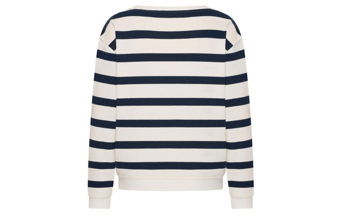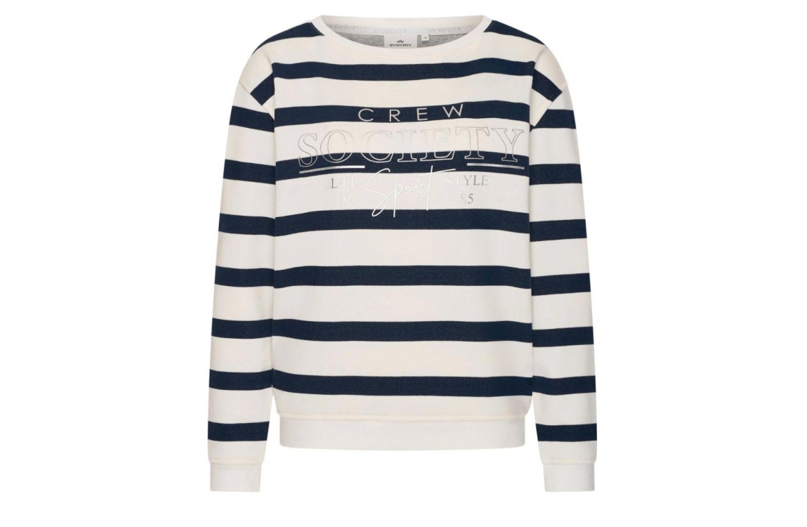 HV Polo sweater HVSKatherine 0401103810. Dit rechtvallend model is voorzien van een ronde hals en heeft lange mouwen. Deze witte/donkerblauwe sweater van HV Polo is all-over bewerkt met strepen en afgewerkt met een subtiele tekstopdruk aan de voorzijde.