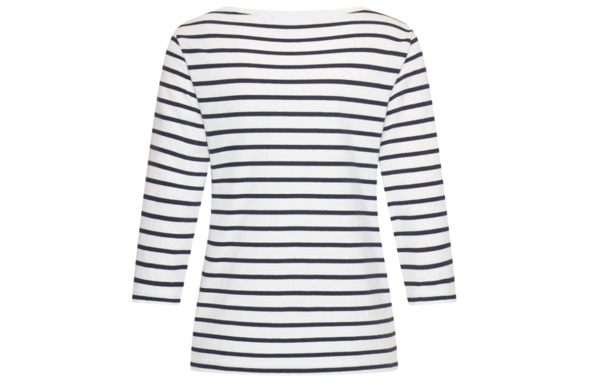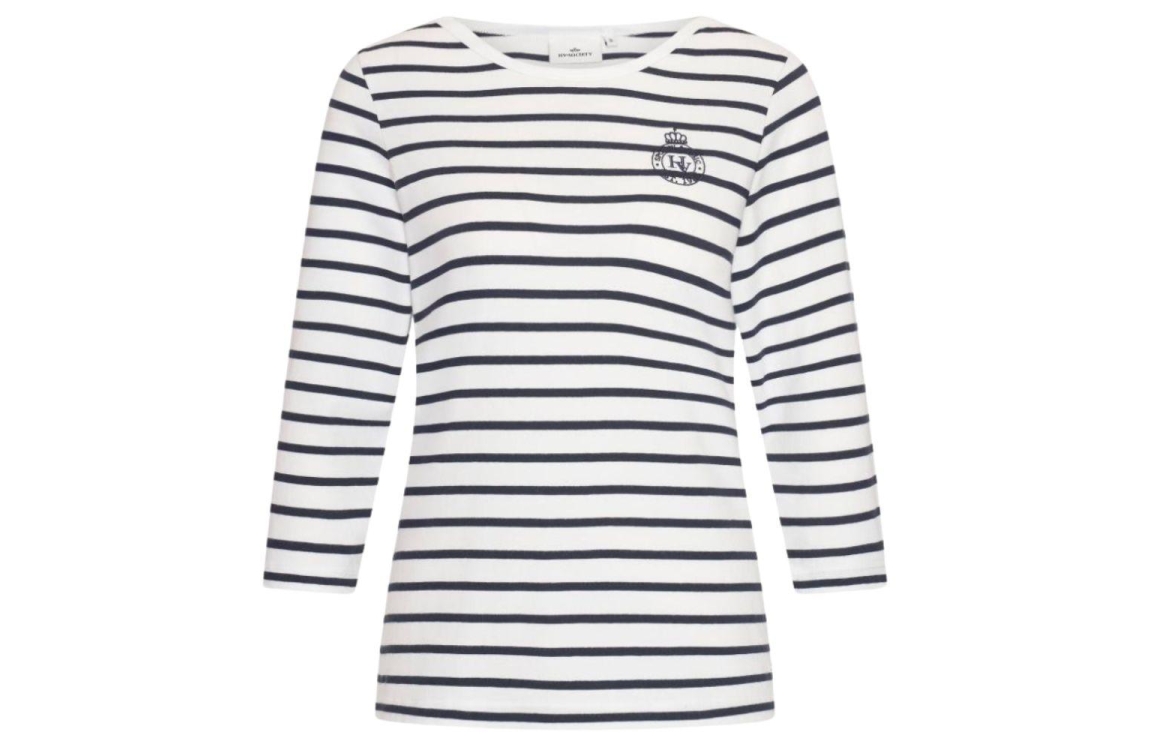 HV Polo top 0403103807. Dit rechtvallende model heeft een ronde/boothals hals en driekwart mouwen. Deze witte top van HV Polo is all-over bewerkt met een donkerblauwe streepprint en is op de linkerborst gedetailleerd met het merkembleem.
