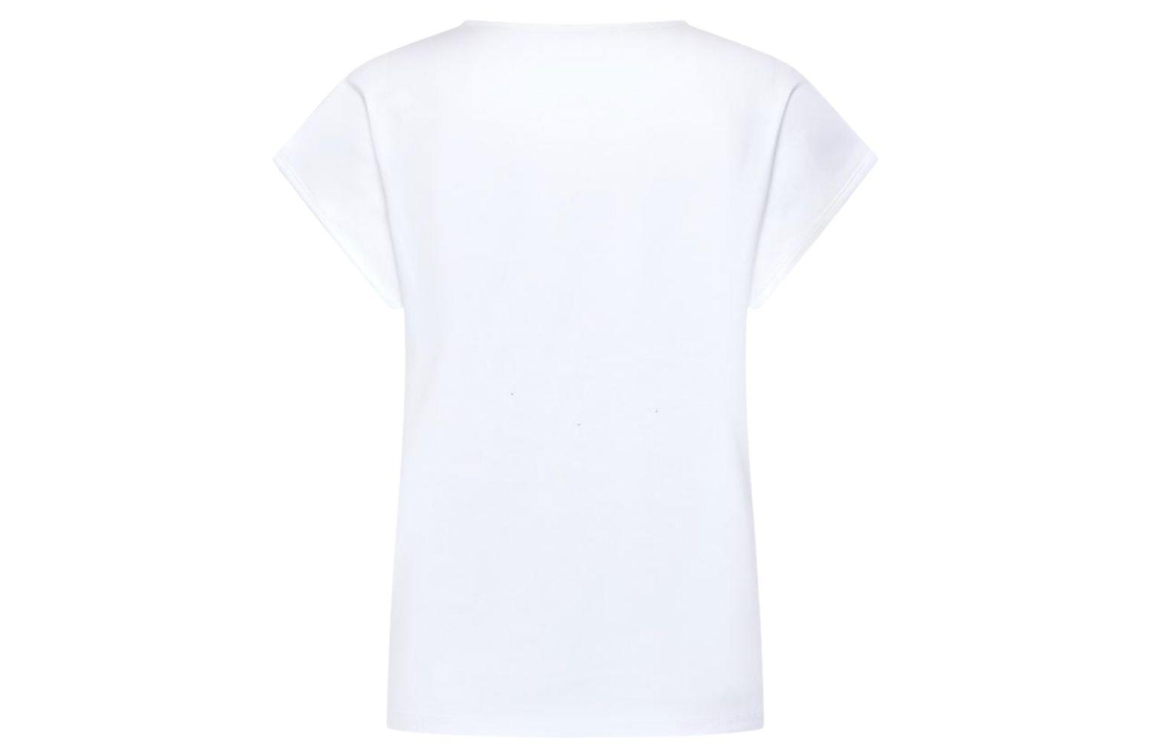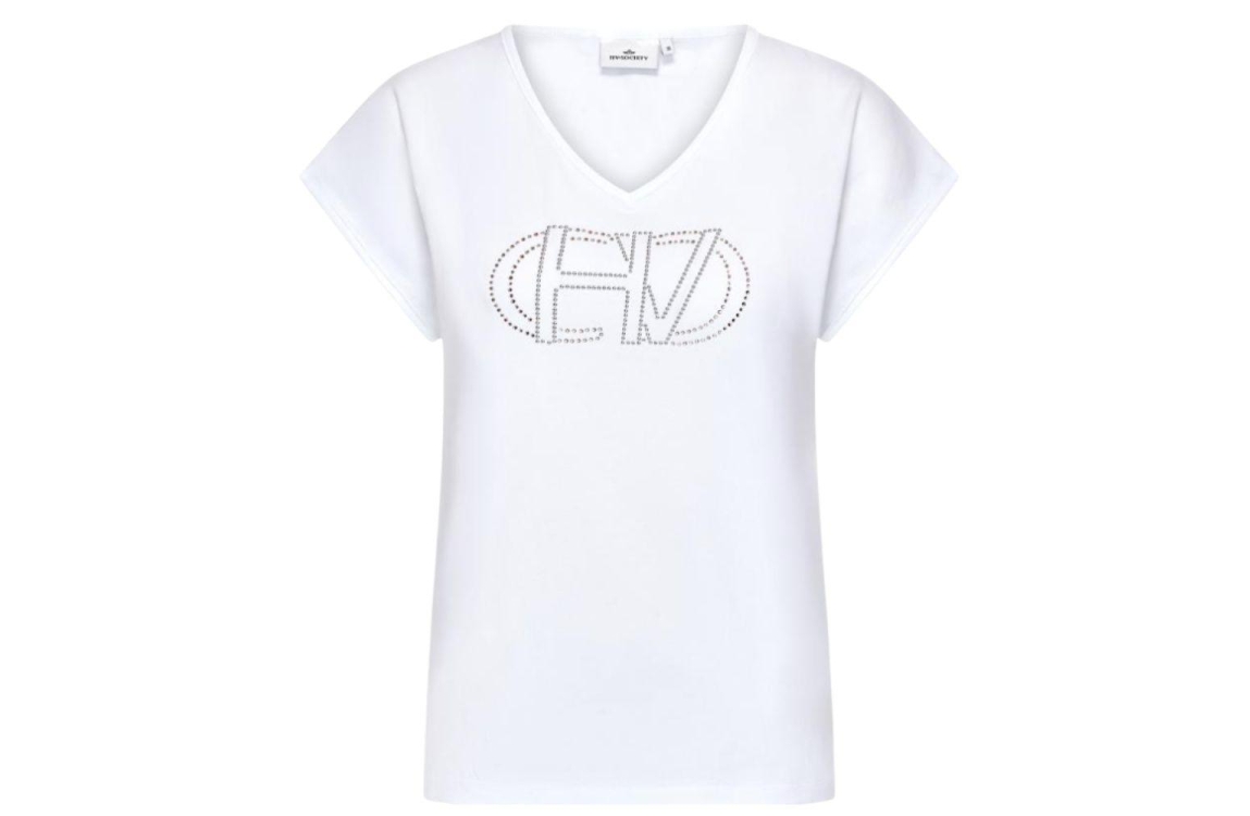 HV Polo top 0403103810. Dit rechtvallende model heeft een V-hals en korte mouwen. Deze witte top van HV Polo is op het voorpand gedetailleerd met strass-steentjes in de letters van het merklogo.
