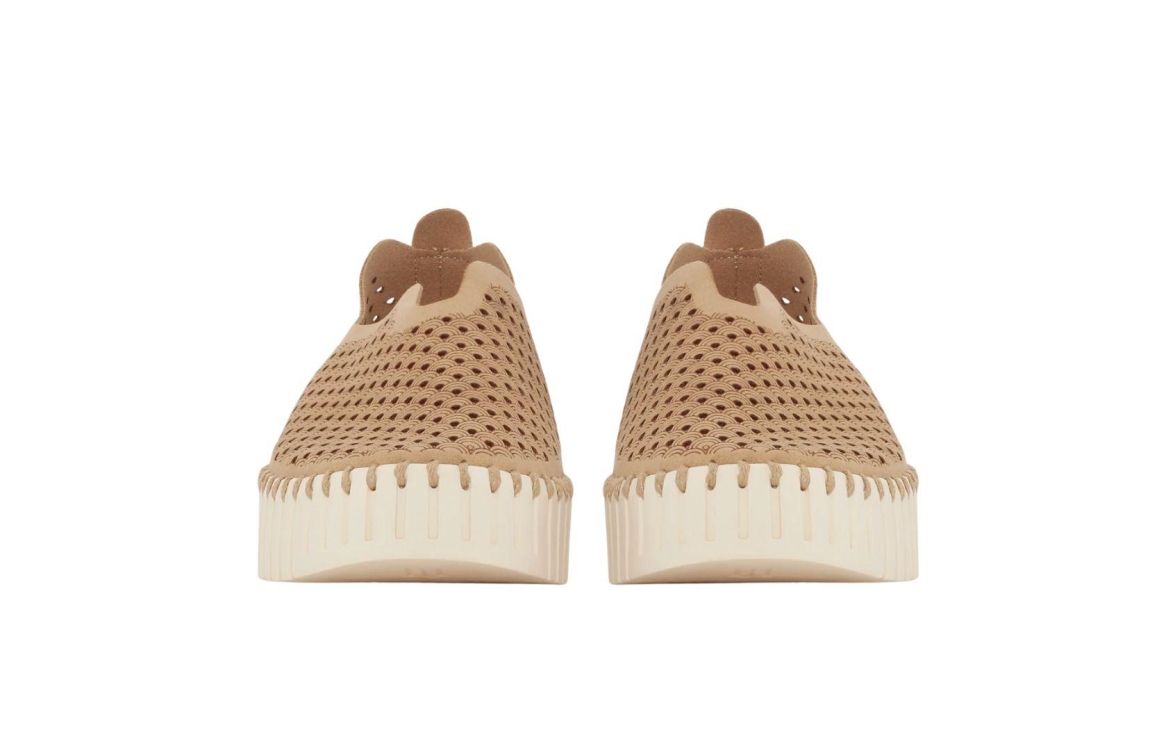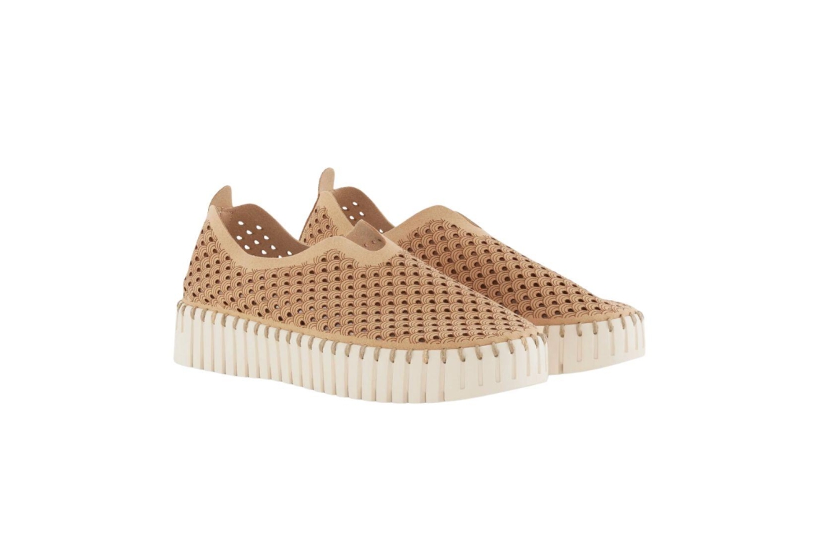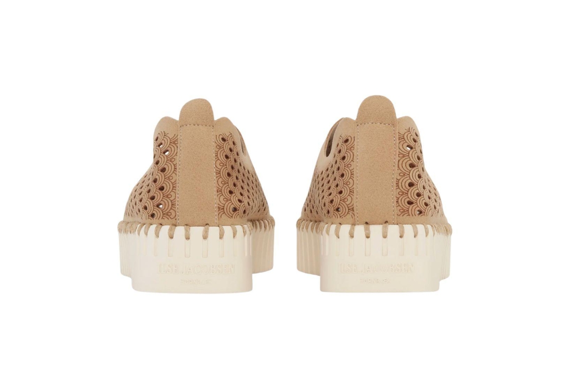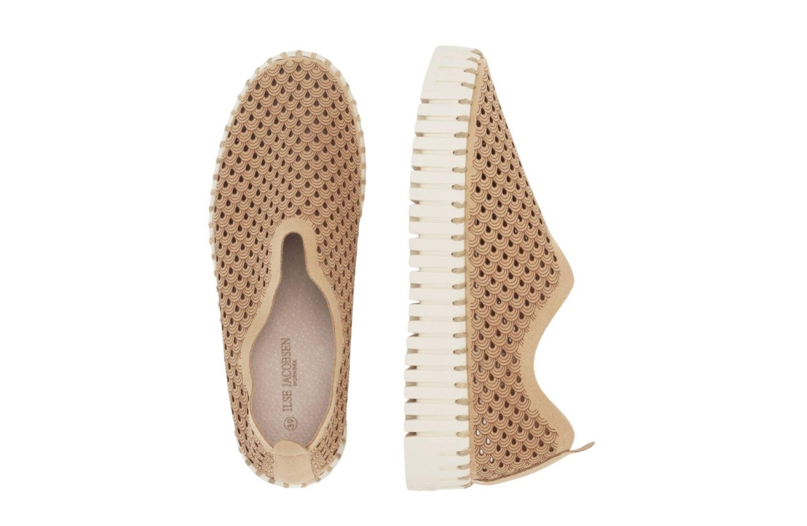 Ilse Jacobsen Flats. Deze beige instappers beschikt over een ronde neus en een lichte rubberen zool. Dit model is opengewerkt uitgevoerd en bevat een comfortabele inlegzool met padding en ondersteuning.