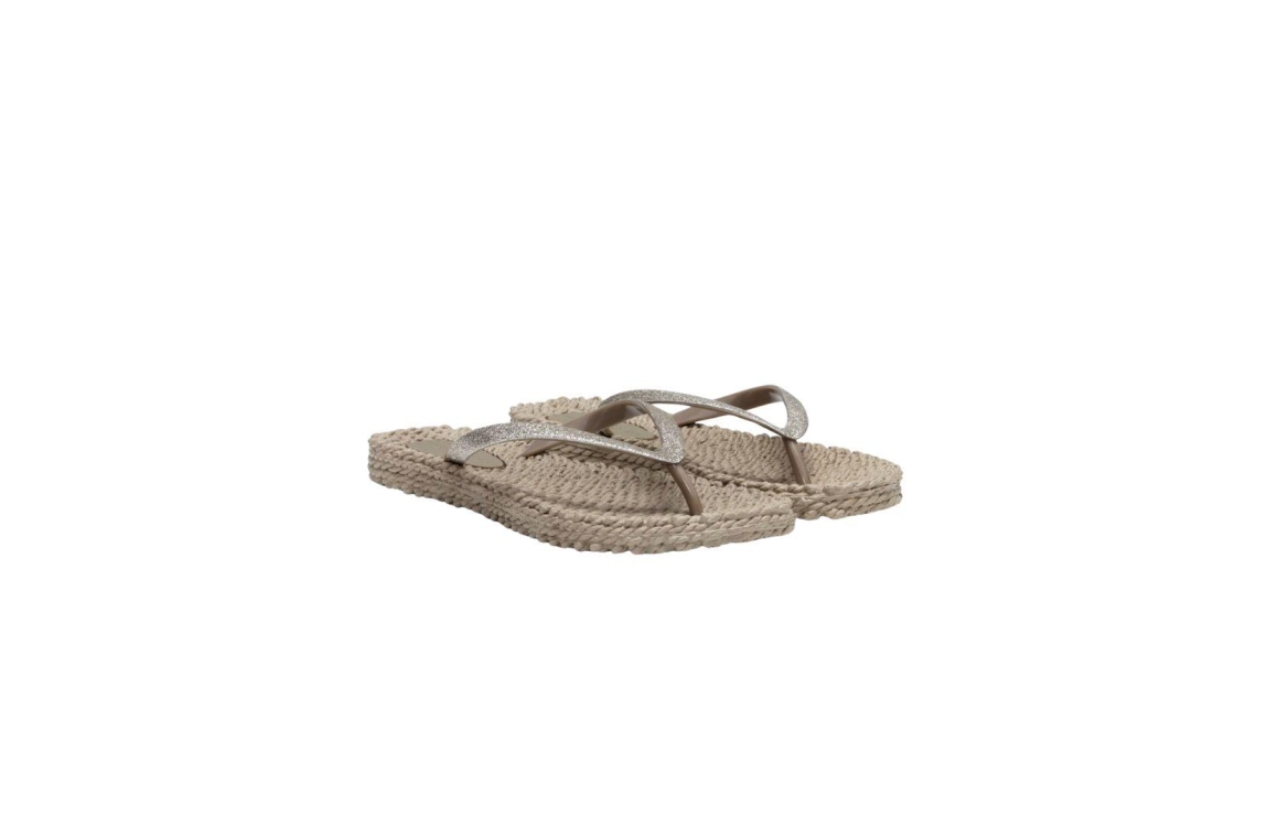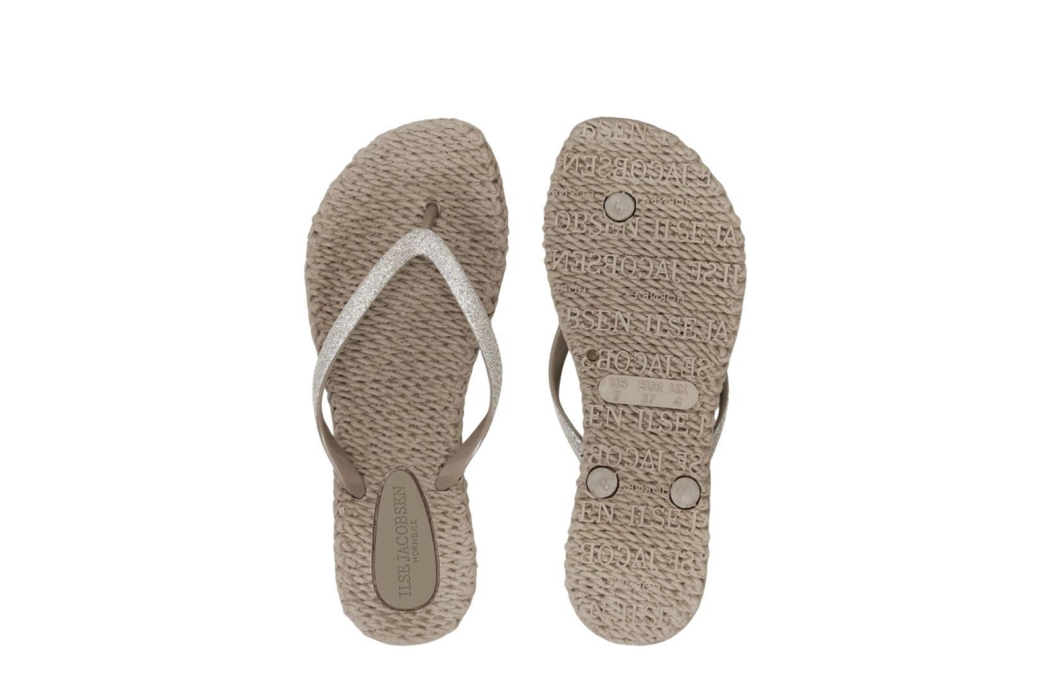 Ilse Jacobsen Flip Flops 149. Deze taupekleurige slipper beschikt over bandjes bewerkt met glitter en over een rubberen zool waardoor ze licht en flexibel aanvoelen.
