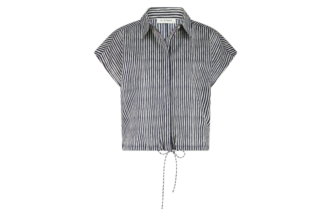 In Shape blouse INS2610672. Dit rechtvallend model is voorzien van een kraag en heeft korte kapmouwen. Deze donkerblauwe/kitkleurige blouse van In Shape sluit door middel van knopen en met trekkoorden aan de onderzijde. Dit model is all-over bewerkt met strepen.