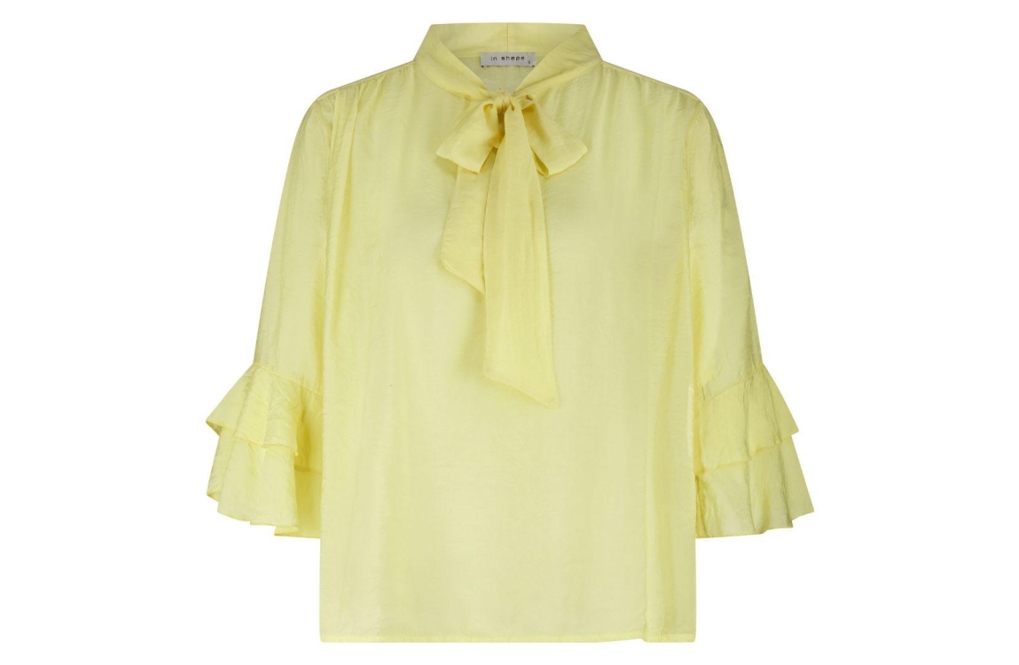 In Shape blouse Margo INS2610660. Dit wijdvallend model is voorzien van een ronde hals met v-inkeping dat sluit door middel van een strik en beschikt over driekwart mouwen bewerkt met ruffles. Deze gele blouse van In Shape is semi-transparant uitgevoerd.