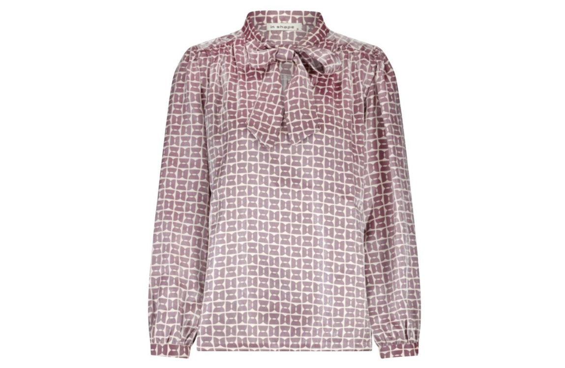 In Shape Daniela INS2530508. Dit rechtvallend model is voorzien van een ronde hals met v-inkeping dat sluit door middel van een strik. Deze burgundy kleurige blouse van In Shape is bewerkt met een grafische print uitgevoerd in een glanzende stofkwaliteit.